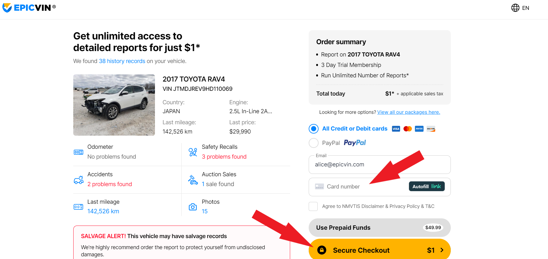 Enter the VIN-number of your car on the home page epicvin.com. You’ll be redirected to our Free Pre-Check report. To upgrade your report and get more information, please choose your payment option on the right: